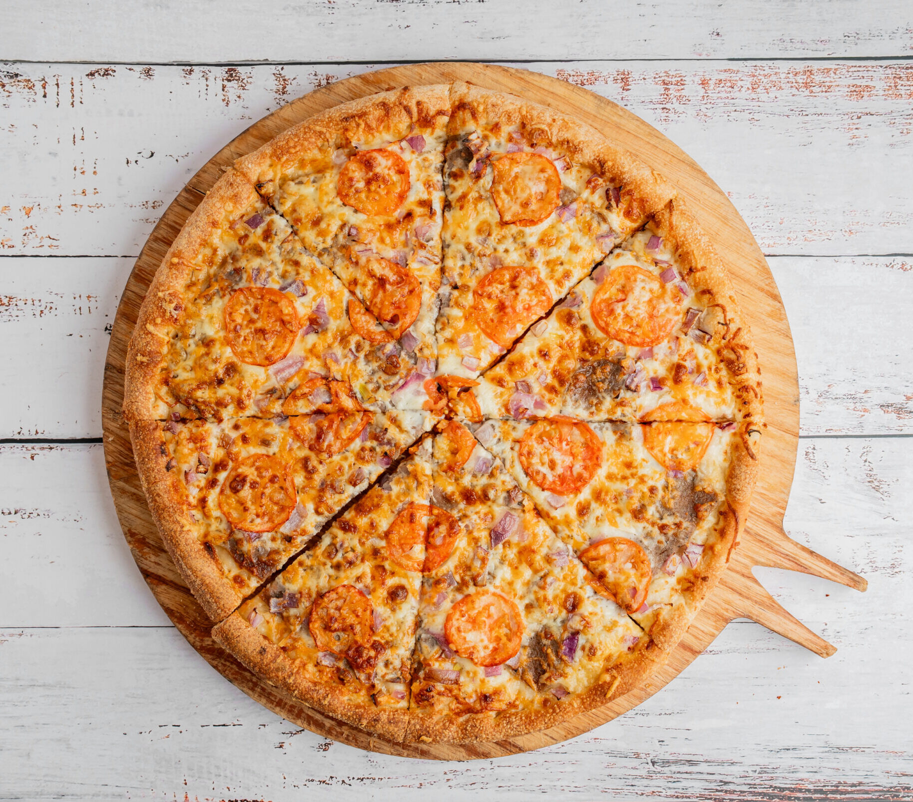 Donair Meat, Red Onion, Tomatoes, Mozzarella Cheese, Cheddar Cheese, Sweet Sauce Base Or Tzatziki Sauce Base(Write your choice of Sauce in notes)