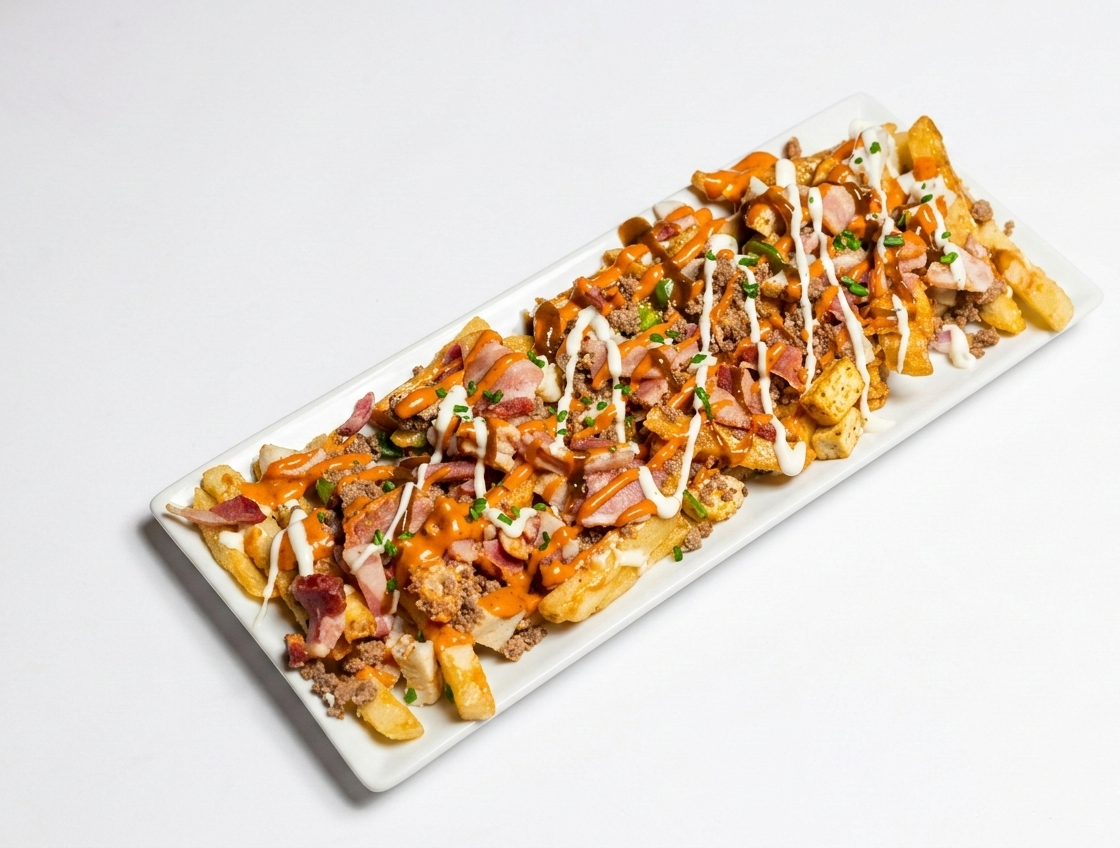 Delicious backed fries topped with chicken, lean ground beef, bacon and covered with melted mozzarella cheese served by drizzle of chipotle sauce .