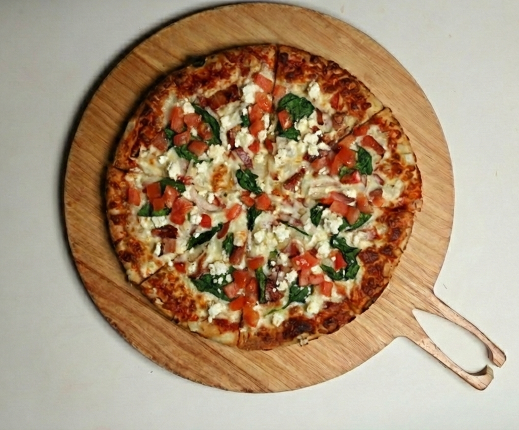 Onion, Spinach, Feta, Fresh tomatoes, Fresh Garlic and Mozzarella Cheese